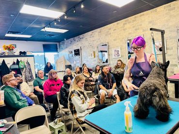 This time we did a Halloween themed interactive team building workshop! We had the wonderful miss Elizabeth Gibbs with us! We got to do hands on creative grooming learning coloring, ombre, tipped ears and tail as well as feather, jewel and stencil application! We had such a blast and everyone got to create their own art on the pups! A special thanks to our wonderful clients for allowing their pups to participate in this incredible workshop!